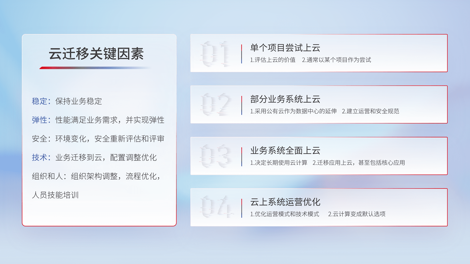 结合实际业务,,从规划设计、、、、云平台选型、、、云原生改造、、、、数据迁移、、集成交付,,,迁移全过程为客户识别最佳上云路径,,,,做好风险识别管理,,设计网络架构、、身份权限、、、安全审计合规、、、、操作审计、、日志审计、、监控告警策略、、、、多站点容灾设计等,,,,对云上基础设施进行整体规划,,,提升IT治理水平,,,,以满足弹性、、高可用、、、、高性能的需求。。