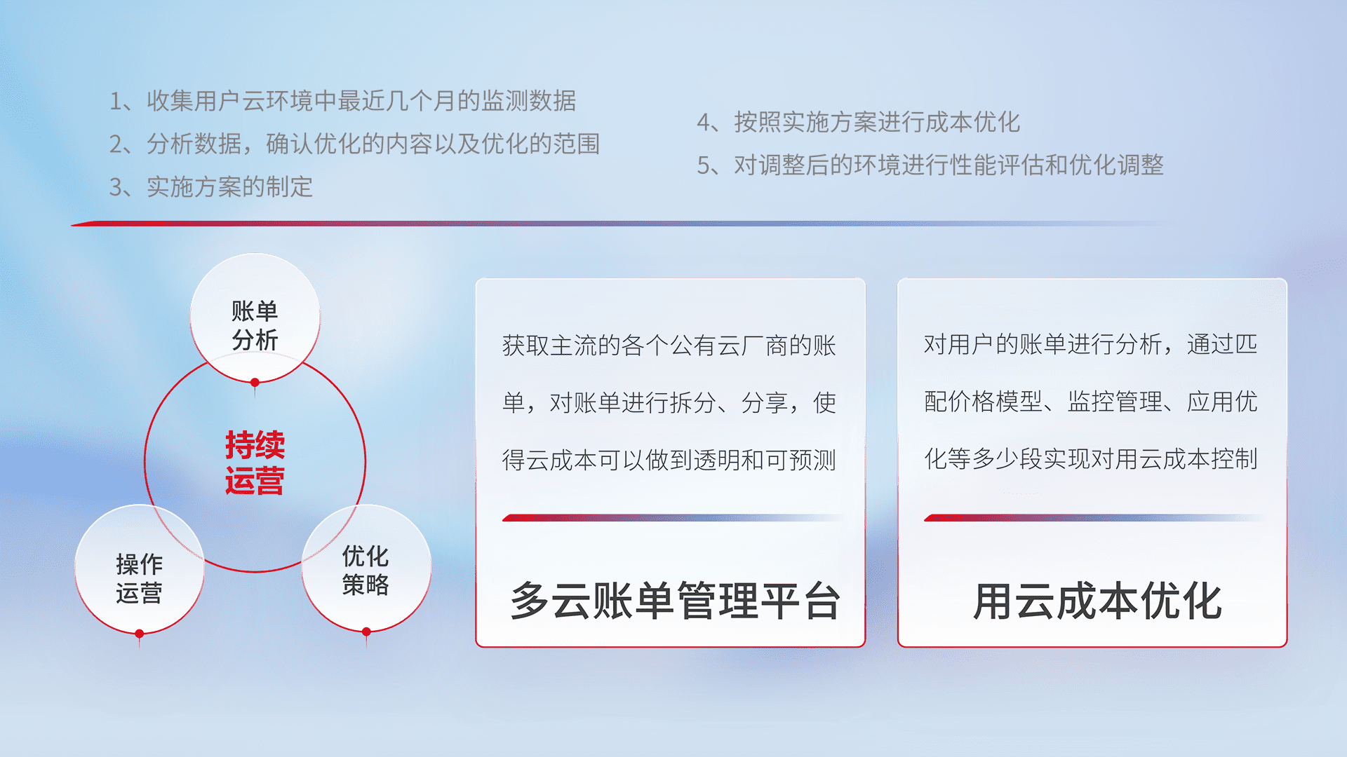 通过多云纳管,,,,以统一的资源数据模型把客户的云资源进行抽象和封装,,,,进而实现对多云资源的统一操作,,,保障云资源管理的可靠性、、、、稳定性与可用性。。。量身定制化运维内容,,,,配置、、、开发运维、、、、补丁管理、、、备份、、监控、、、认证和访问管理、、、审计和日常巡检等,,保障在用云过程中的可靠度,,,稳定度以及高可用率。。。